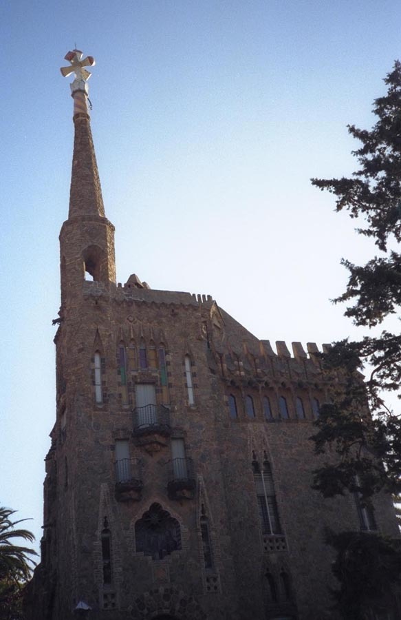La casa del custode ha dunque uno schema a “L” e ad ali uguali, nei punti di raccordo dei tre volumi sono ricavati i vani per gli ingressi e per le scale. Di grande interesse è l’intreccio tra componenti statico-strutturali e varietà di decorazione delle superfici. Gaudì affida alla terra cruda, materiale a basso costo e di buona capacità termica, solo funzione di muro di tamponamento. I mattoni in argilla cotta invece, dai colori cangianti dal rosso al giallo, vengono da lui posizionati nelle parti di muro più fortemente sottoposte a sforzi di compressione e negli angoli della costruzione. Sono lasciati in vista e legati tra loro con strati di malta nella quale vengono impastati frammenti di vetro colorato. Le superfici in terra cruda vengono invece rivestite da blocchetti prefabbricati in calcestruzzo, che disegnano chiare ondulazioni a semicerchi e sferette a rilievo. Il coronamento delle pareti esterne della casa è realizzato con normali mattoni cotti d’argilla rosso scura, disposti in modo da disegnare una vivace merlatura, appoggiata su un piano orizzontale a forte sbalzo dal muro, con profilo verticale ad aggetto progressivo.